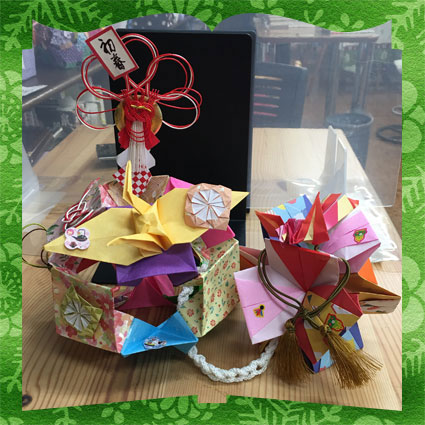 | 折り鶴を2羽乗せたことでボリュームが出たような気がします。くす玉も見る角度でいろいろな模様に見えて楽しいです。 |