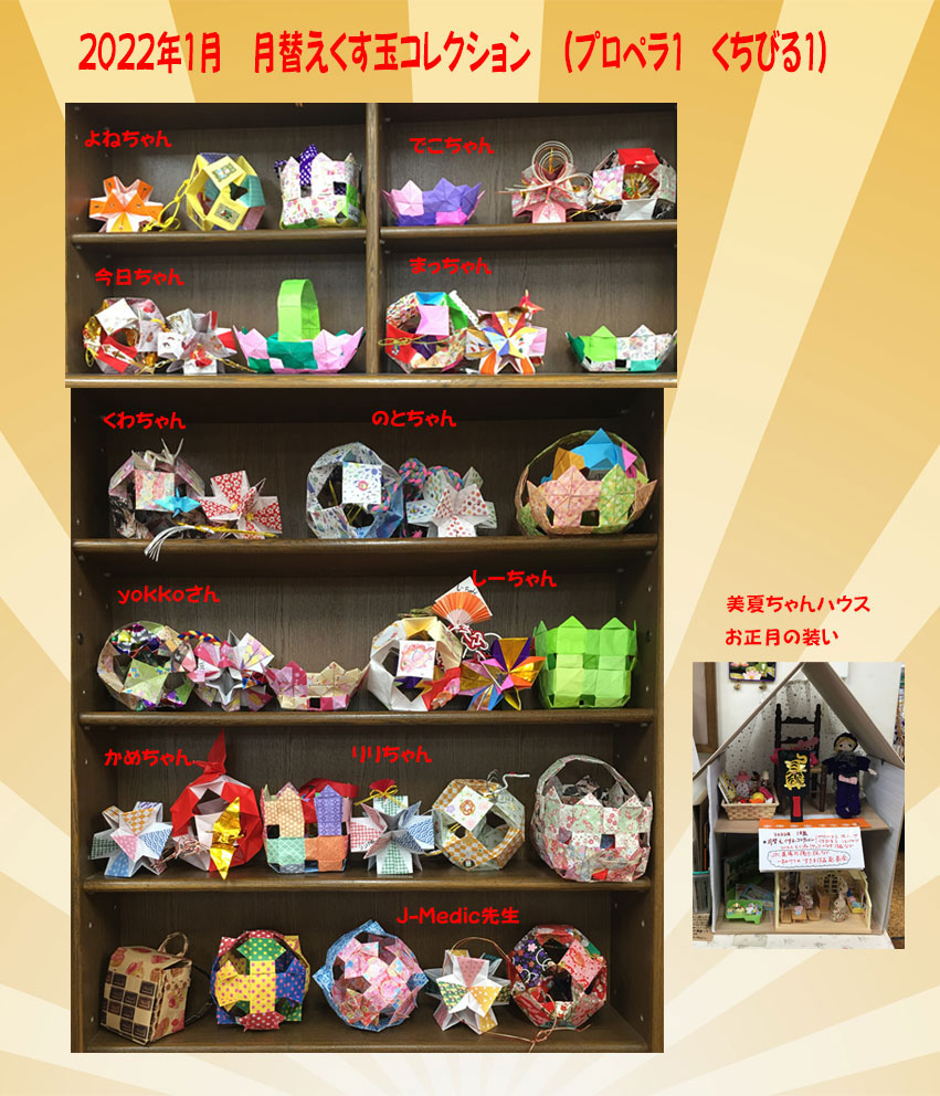 | 1月のくす玉はお正月の雰囲気満載で華やかな飾り物で豪華です。くちびる1もプロペラ1も模様の折り紙で作ってあるので高級なイメージです。追加で奴つなぎのくす玉や小物入れ他を添えています。今回もよねちゃんにお手伝いいただいての完成です。美夏ちゃんハウスも寅の羽子板を飾ってもらってお正月らしくなりました。 |