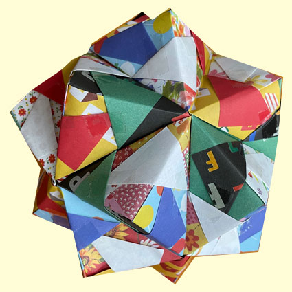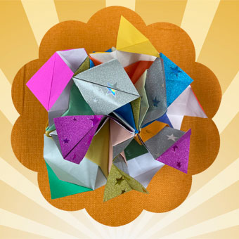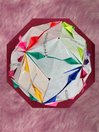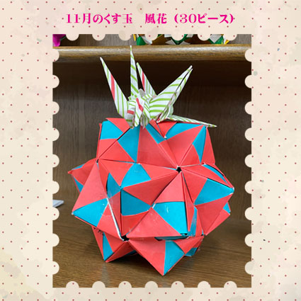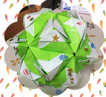 折り方は先生のを拝借しました。折り方を見てすぐに思い出せるかは疑問ですがもう一度作ってみたいくす玉に一つです。 |