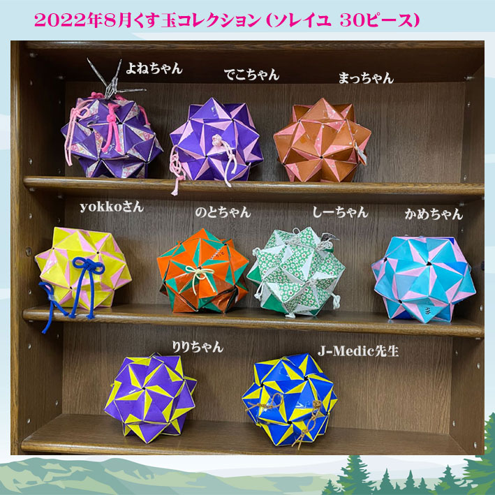 | 8月のくす玉コレクションはソレイユの30ピースです。2色できれいに風車が回っているような模様が出て素敵です。単色も色の組み合わせで違う感じになりますね。それぞれのくす玉もポイントの飾り付けで着飾っていますね。 |