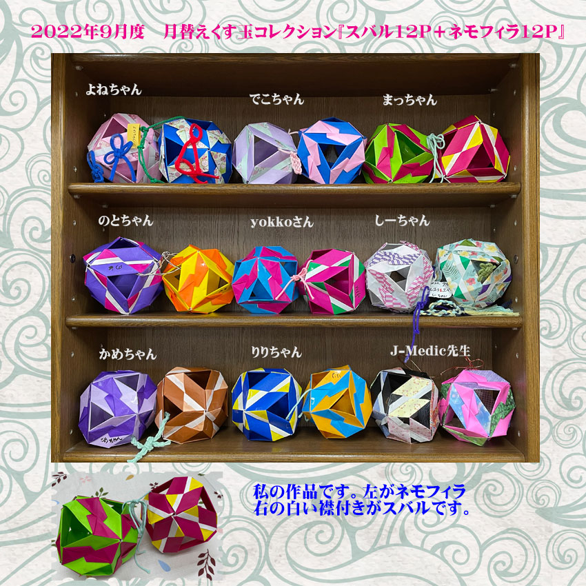 | 9月のくす玉コレクションはネモフィラとスバルで各12ピースで作ります。ひとつのピースが色違いで組み合わせる色によってさまざまな模様に見えて個性が表れます。今回はハッキリした色目の折り紙が目立ちました。組み立ては早くできました。 |