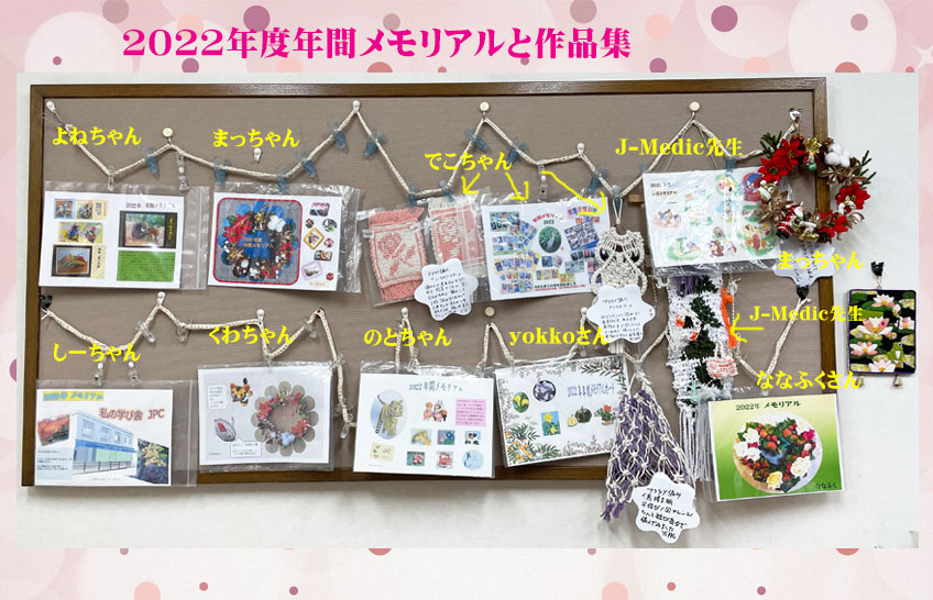 | 2022年もあと少しで終わろうとしています。あまりいい年ではなかったように思います。JPCメンバーさんの思い出は?よねちゃんは旅行もたくさん行って油絵もたくさん描いて充実した一年でしたね。でこちゃんはたくさんの本を読まれて感想文もしっかり書かれていますね。手芸がお得意でマクラメ作品もたくさん作られました。しーちゃんは怪我をしながらもたくさんのクリスタ画を描かれました。くわちゃんと一緒にリースを作りました。寅さんとウサギさんの置物が可愛いです。のとちゃんの寅さんが貫禄ありますね。2羽のウサギさんが可愛いです。左側の子がうーちゃんに似ているので思い出しました。yokkoさんのお花畑に大きなカボチャが貫禄がありますね。マクラメ作品もたくさんできましたね。ななふくさんのハート型のデコレーションに昔の思い出が詰まっているのですね。先生の表紙は可愛い干支のクリスタ画とマクラメ編みのクリスマスツリー・飾り付けにもマクラメあみの小物をあしらって素敵です。まっちゃんはクリスマスリースは手芸教室で作りました。表紙にも使いました。 |