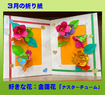 2025.03.01 3月は好きな花で金蓮花(ナスターチューム)を折りました。わくわくタイムで作った写真立てに貼り付けました。葉っぱはもっと丸いのですが作ったあとで調べたのでこのままにしました。 |