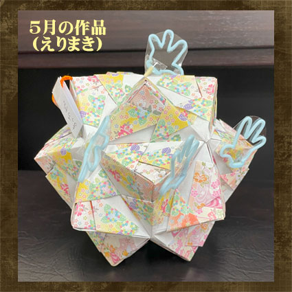 | 5月のくす玉(えりまき)は久しぶりに大きくボリュームがあっていいですね。色とりどりの折り紙もにぎわいを見せています。組み立ては簡単にできました。こどもの日にふさわしい可愛らしい色目でやさしさを感じます。暖かくなってきて自然と明るい色合いの折り紙を使うようになってきたのでしょうか?春を感じます。 |