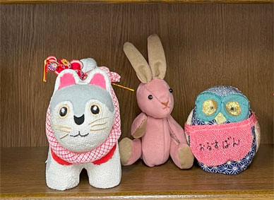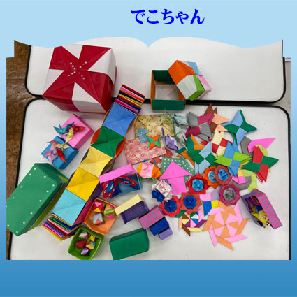 | 10月の折り紙は宝箱で今までに教えていただいた折り紙やオリジナルの作品で箱の中身をいっぱいにしています。棚の見た目は寂しいけれど蓋をあければ何と宝物がわんさかと出てきます。それぞれの箱の中身を見せていただいてびっくりです。 |