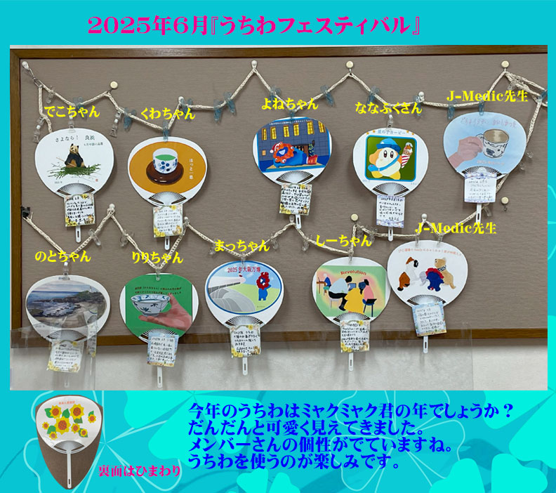 | 2025.06.01 テーマは今年らしいうちわが課題でしたのでメンバーさんの今年がひとめでわかります。体験したこと(写生に行ったこと・万博に行ったこと・プレゼントにもらったお気に入り等々)暑い夏も乗り切れますね。残りの半年も楽しみにしています。 |