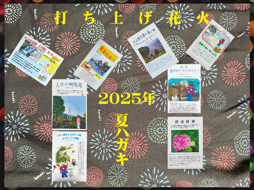 2025.07.09 毎年楽しみの夏ハガキが届きました。皆様の暖かい励ましのお言葉に夏バテ知らずで毎年暑い夏を乗り切っています。益々暑い日が続きますが今年も皆様に元気を頂きました。打ち上げ花火のつもりです。 しーちゃん:ホツと気分転換 水分補給 笑いましょう のとちゃん:未来社会へ でこちゃん:人生の観覧車 J-Medic先生:人生二度目のEXPO大阪行けたことに感謝 よねちゃん:宮古島の青い海と蝶 りりちゃん:暑い夏 熱中症に気を付けて!ななふくさん:好 去 好 来 まっちゃん:元気で会いましょう ありがとうございました。