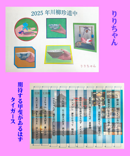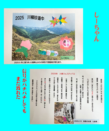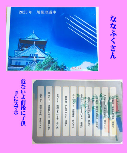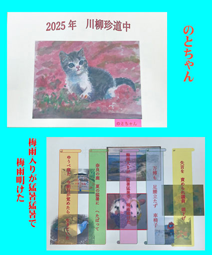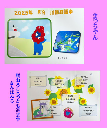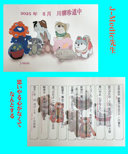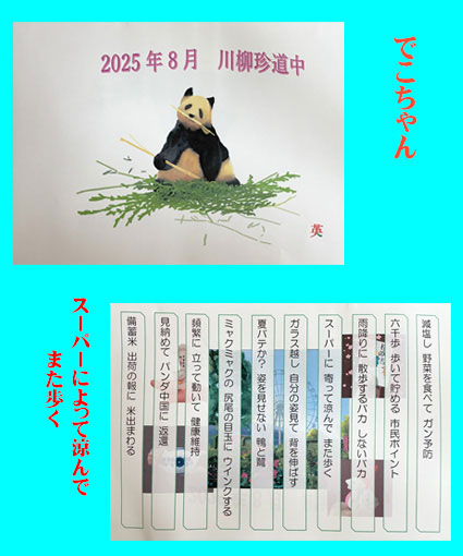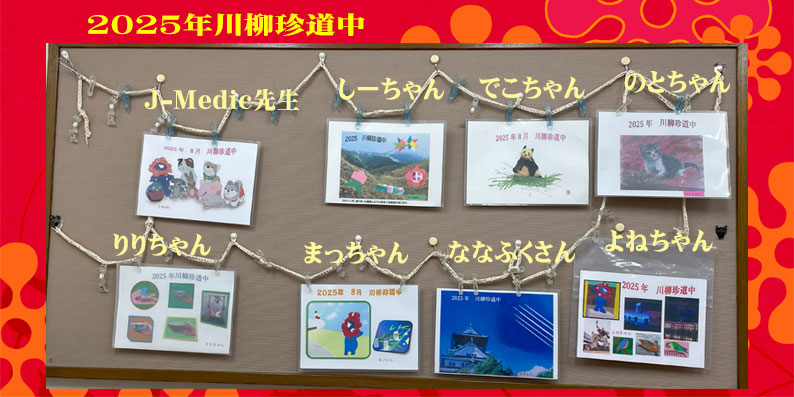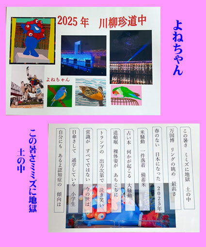 | 8月は川柳珍道中から始まります。表紙に今年を思い出すデザインで作っています。裏面は今までの政治・経済・世の中出来事・私たちが見て感じたことなど様々な事を川柳で読んでいます。世の中の事を皆さんがよく感心を持って観察されていますね。残り数か月何事もなく無事に過ごせますようにと祈るばかりです。 |