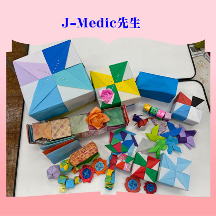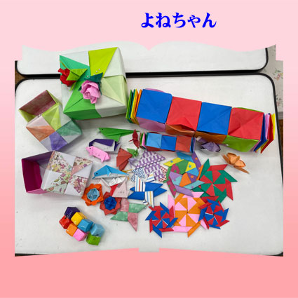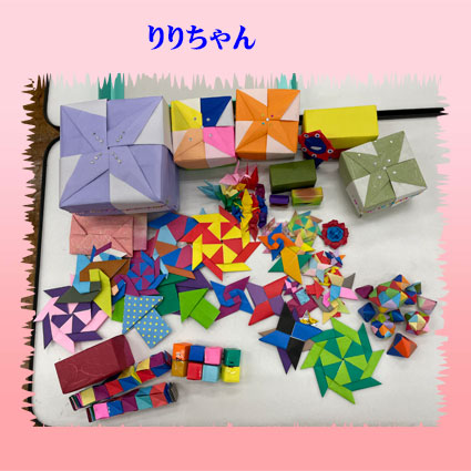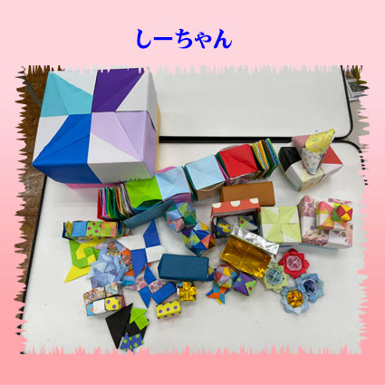 スパイラルキューブの長さにビックリです。大きさの違う箱もいっぱい出てきて蓋を開けるのが楽しかったです。折り紙の達人になりましたね。 |