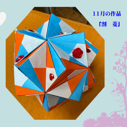 | 11月のくす玉は割菱です。久しぶりに大きさが揃ってきれいですね。色とりどりの折り紙で美人ばかりです。折り方も簡単でした。組む時もさほど複雑さもなくスムーズにできました。みんな揃ったときは心もウキウキします。 |