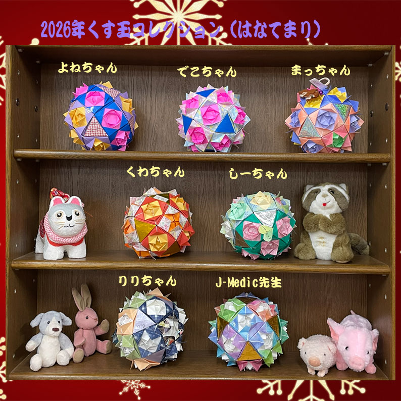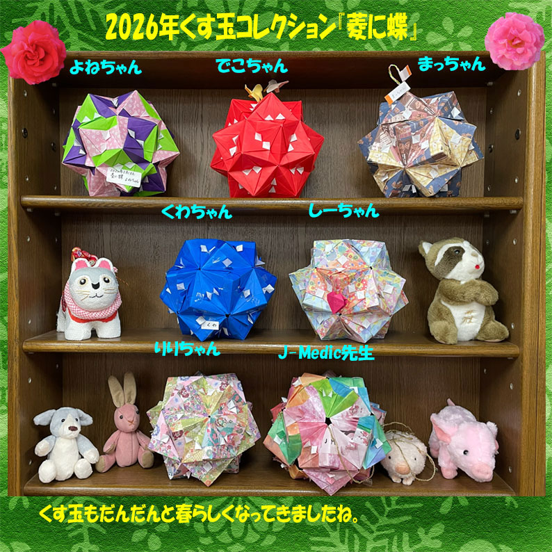 | 2026.01.01 新年のくす玉コレクションは(はなてまり)です。新しい年にふさわしくパッと飾り棚に花が咲きました。色とりどりの折り紙で一人ひとりの個性が出ていますね。見守り隊も賑やかな棚になって喜んでいることでしょう。今年もメンバーの皆様についていけるように頑張りますのでよろしくお願いいたします。 |