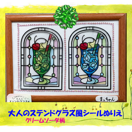 ステンドグラス風シールぬりえ(クリームソーダ柄)暖房の効いた部屋で折り紙をしているとのどが乾いてきます。そんなときにクリームソーダがのどを潤してくれるでしょうか?模様は複雑ですが簡単にできました。 |
