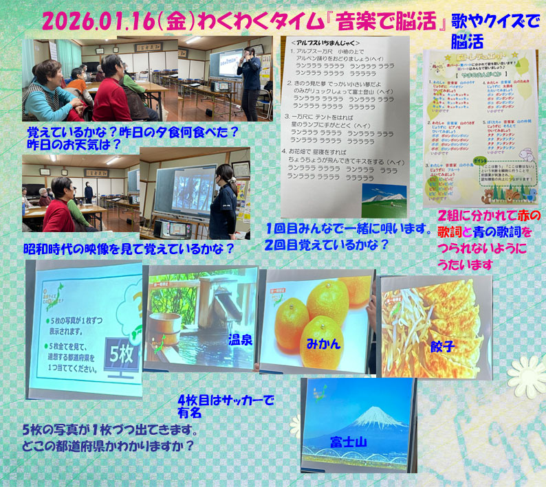 | 2026.01.17 16日のわくわくタイムに行ってきました。「音楽で脳活」どんなことをするのだろうと楽しみに行きました。最初は昨日のことを思い出せるかな?から始まって みんなで一緒にアルプスいちまんじゃくを歌いました。4番までですがまだまだ続きがあるそうです。つぎに映像を見て歯抜けの所を思い出しながら歌います。脳トレデュエットのルールは赤パート・青パートに分かれてうたを歌います。紫はみんなで歌います。【やまのおんがくか】テンポが速いのでついて歌うのがなかなか難しいでした。最後は5枚の画像が1枚づつでてきます。5枚で共通の都道府県は何県でしょうか?何枚目でわかりましたか? |